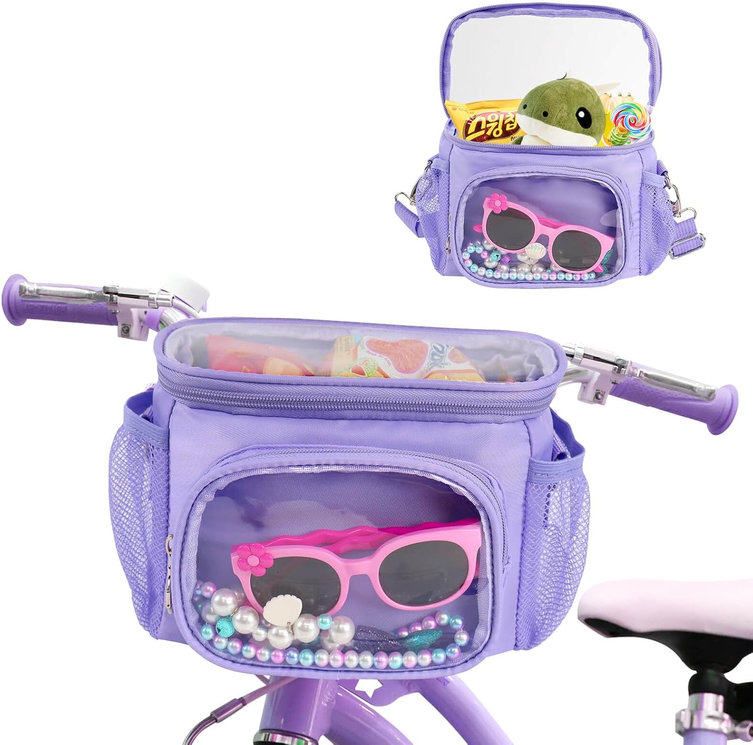 Kids Bike Accessories for Little GirlsStill looking for must-have bike accessories for lovely little girls adventure bikers?Our kids bike handlebar baskets are perfect for you.Product SpecificationsFabric: waterproof nylon and clear PVCSize: 7.9in x 3.9in x 6.2inColor: pink / rose red / purpleProduct Packaging: 1 bike basket front1 adjustable shoulder strap